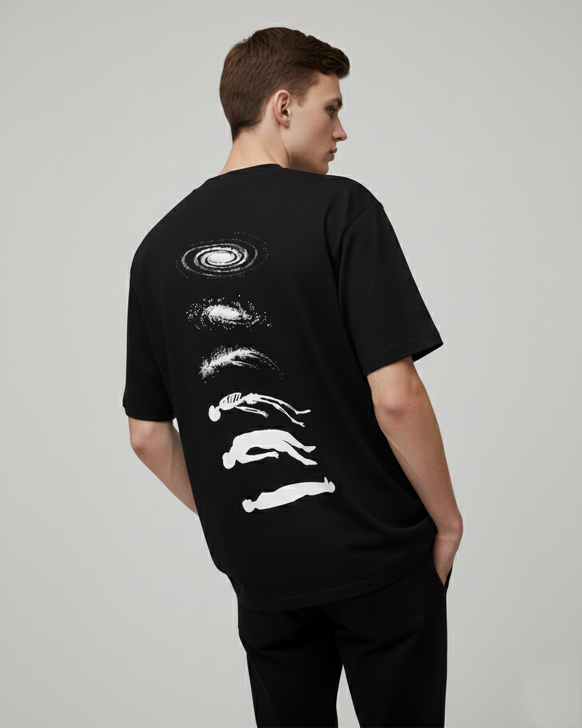 Designed in a premium oversized fit, this black oversized t-shirt for men is crafted from 100% high-quality cotton, offering all-day comfort with a relaxed streetwear silhouette. The striking back graphic blends abstract art, cosmic elements, and artistic minimalism, making it a standout piece for modern streetwear wardrobes.