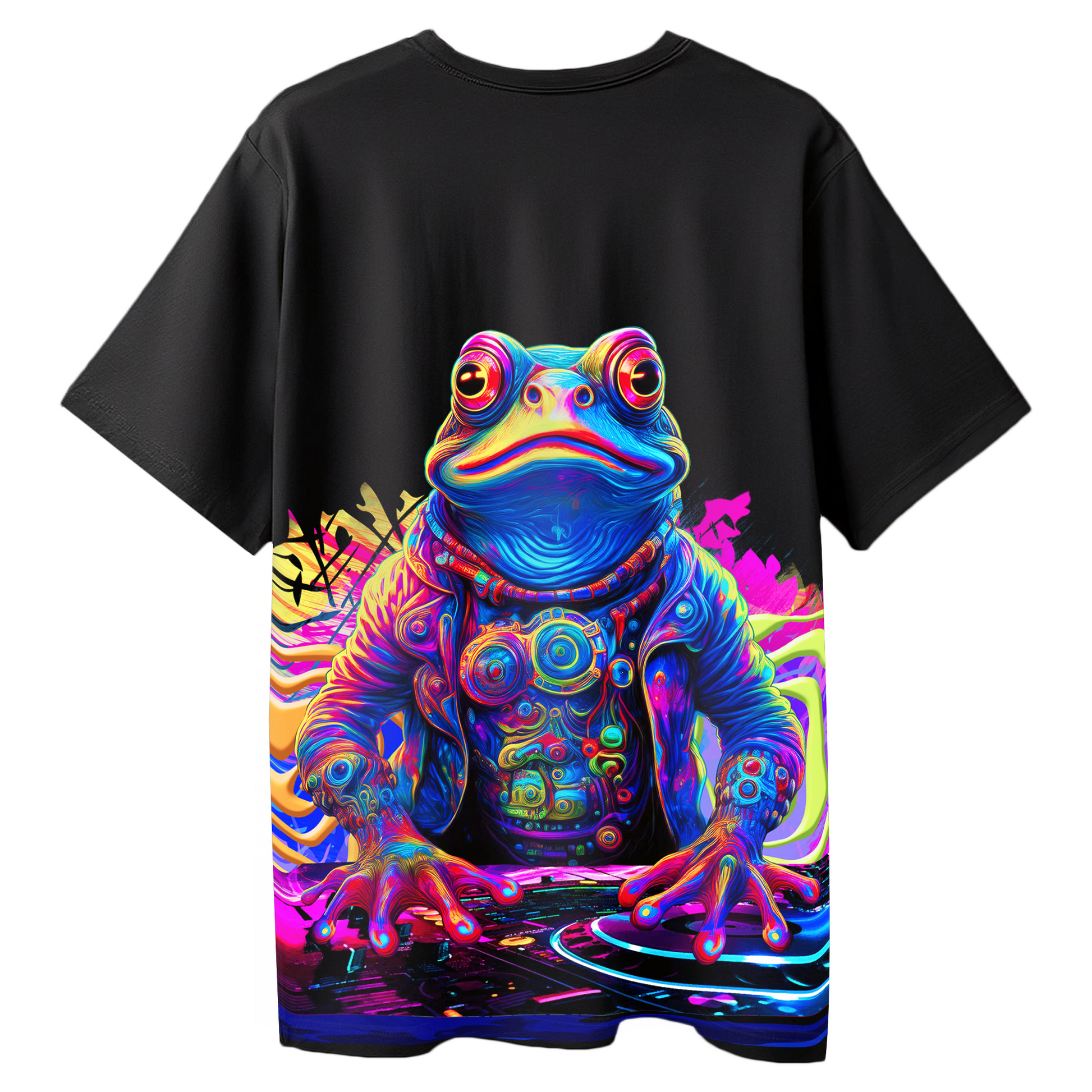 Add groove to your wardrobe with the DJ Frog oversized black t-shirt for women by Alt Art. A psychedelic frog spinning decks steals the spotlight on this bold streetwear piece. Crafted for music lovers and free spirits, it’s the perfect blend of eccentric style and all-day comfort.