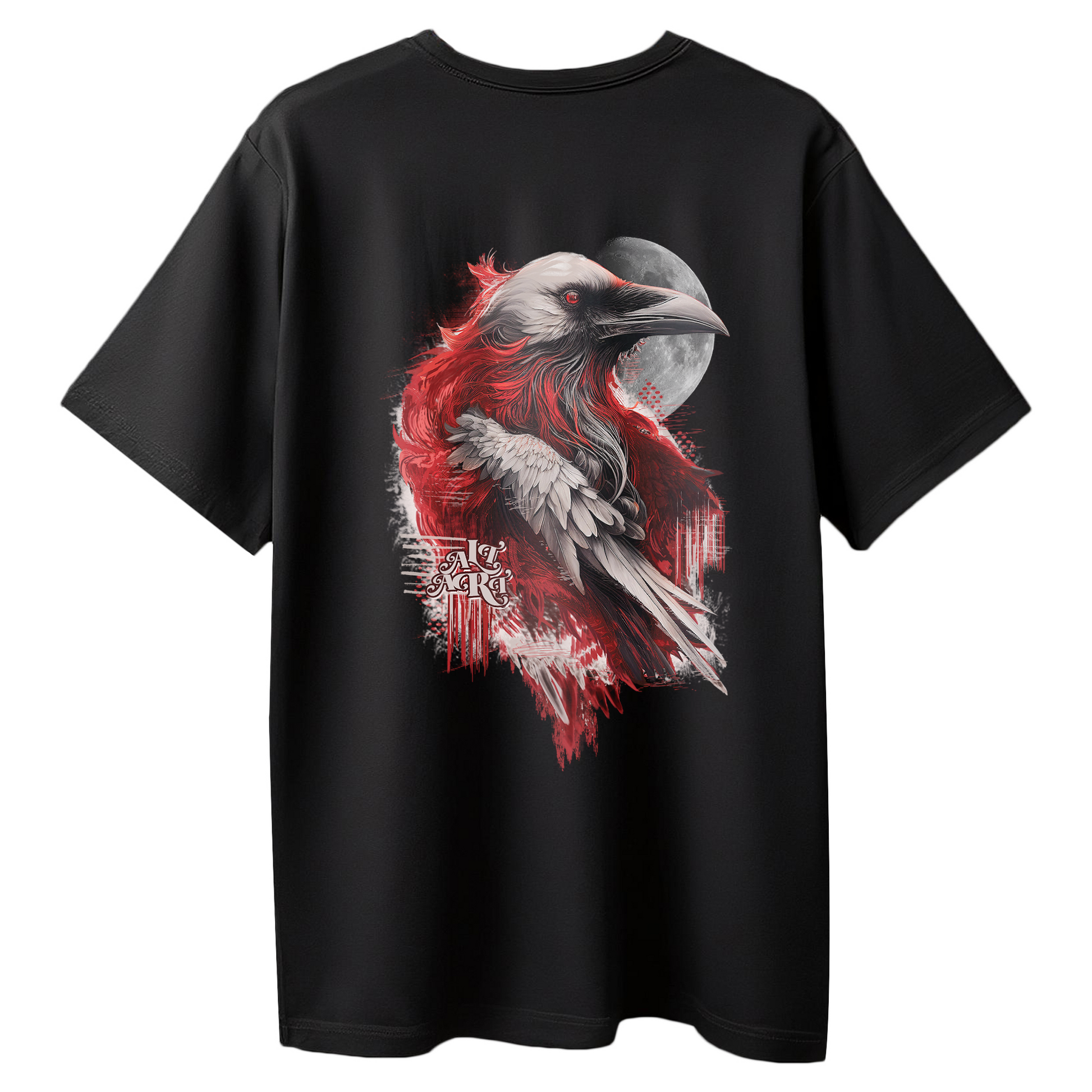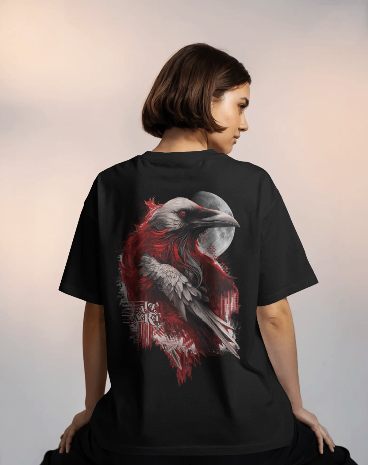 Own your dark feminine energy with this gothic raven oversized t-shirt for women. The design features a fierce abstract raven wrapped in bold red textures and feathery white, under a glowing full moon. The black backdrop and streetwear silhouette make it a perfect blend of bold, gothic, and artsy. For the woman who creates her own path — loud, free, and unapologetically her.