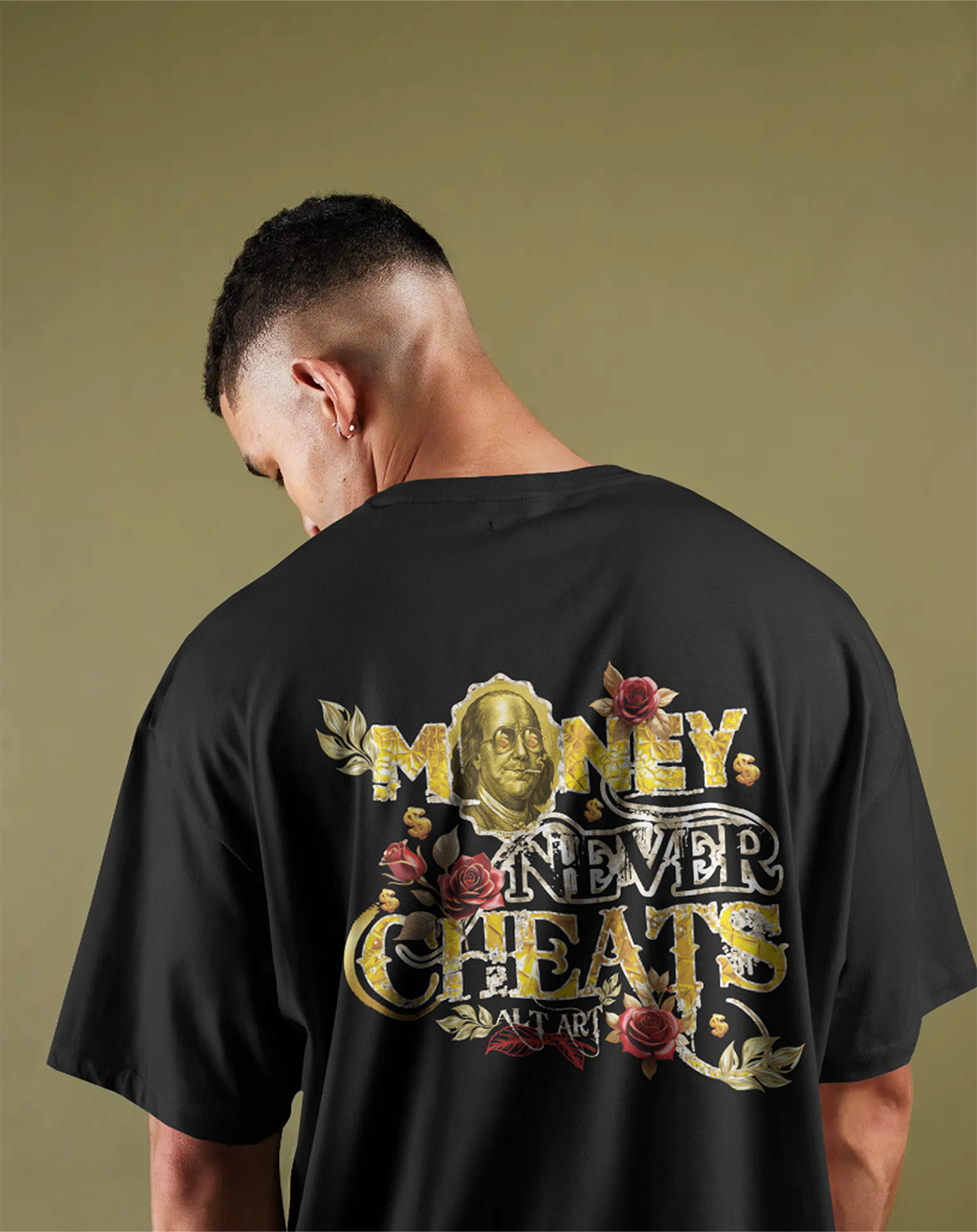 Money Never Cheats Men's Black Graphic Printed Oversized T-Shirt