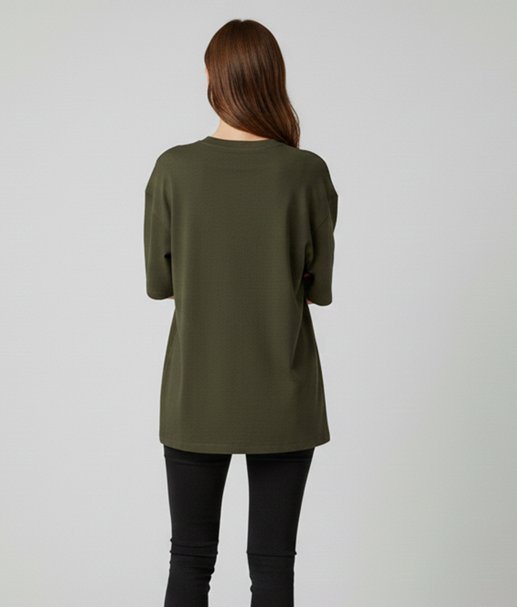 The muted moss green colour brings a calm, minimal, aesthetic vibe — perfect for women who prefer clean, elegant streetwear or capsule-wardrobe basics. Designed with a drop-shoulder, roomy oversized silhouette, it drapes beautifully on all body types without clinging, making it ideal for casual outings, airport looks, college, or cosy everyday styling.