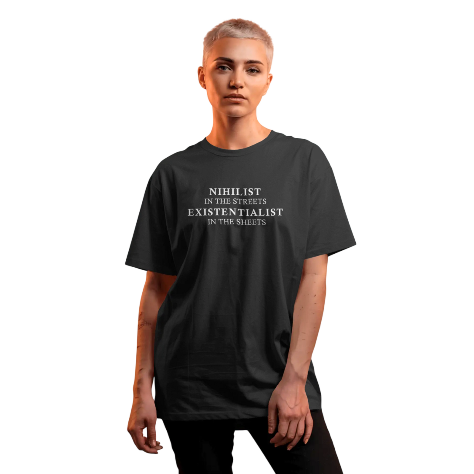 Nihilist in the Streets, Existentialist in the Sheets – Black Oversized T-Shirt for Women & Girls Bold Dark Humor Tee
