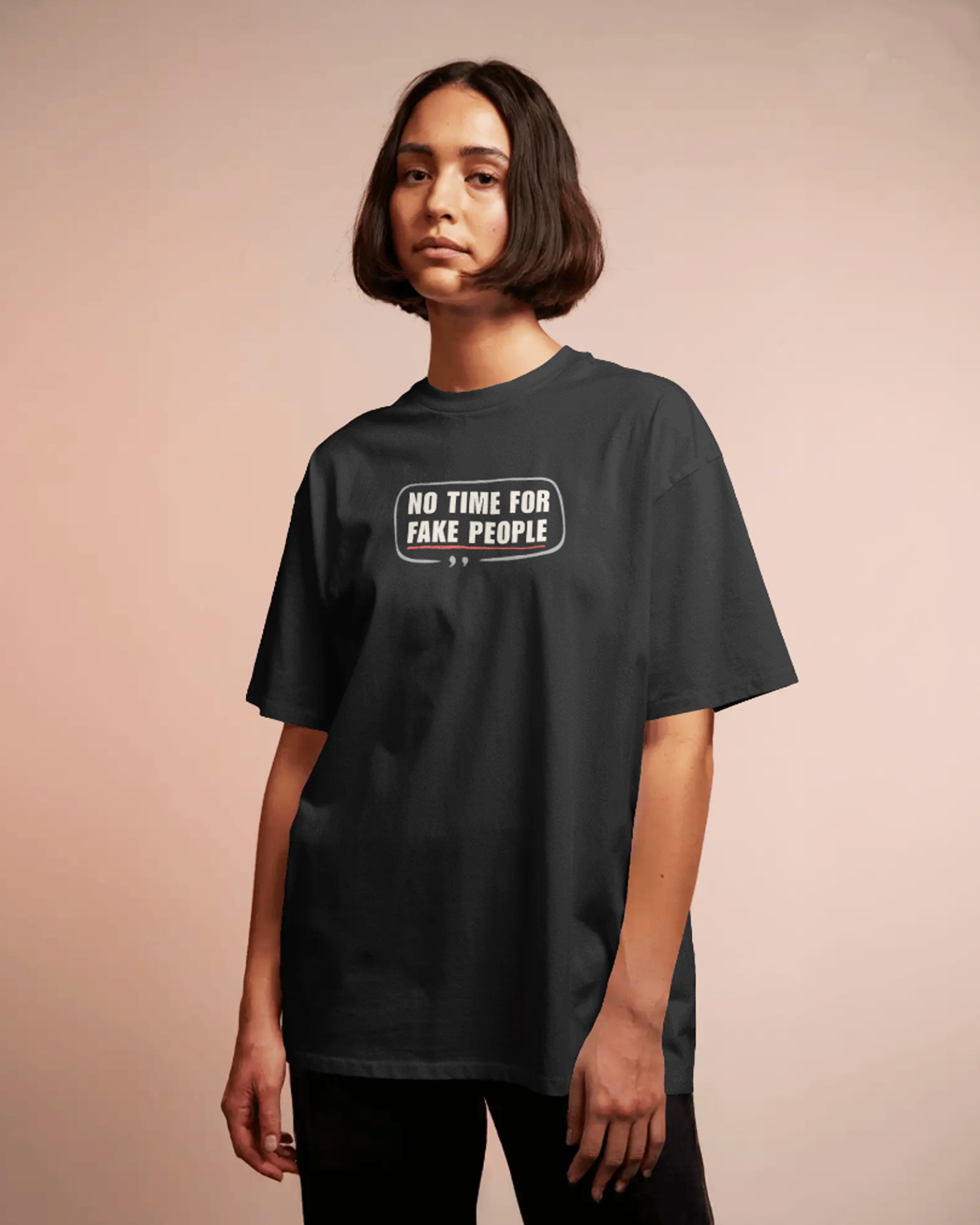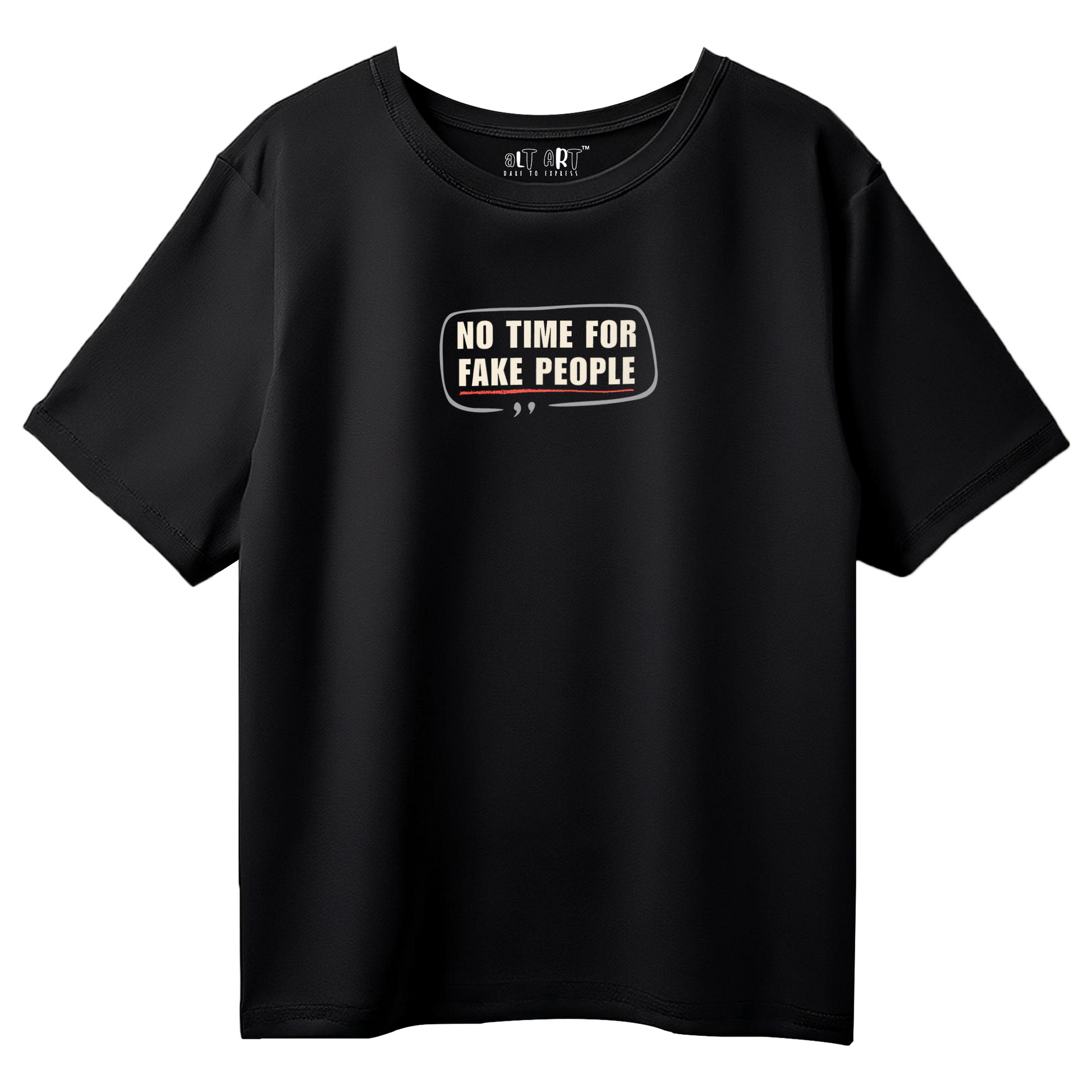 Ditch the drama, not your style. Alt Art’s No Time for Fake People oversized black t-shirt for women is your unapologetic wardrobe essential. With a punchy graphic on jet black cotton, this tee keeps things real — effortlessly.