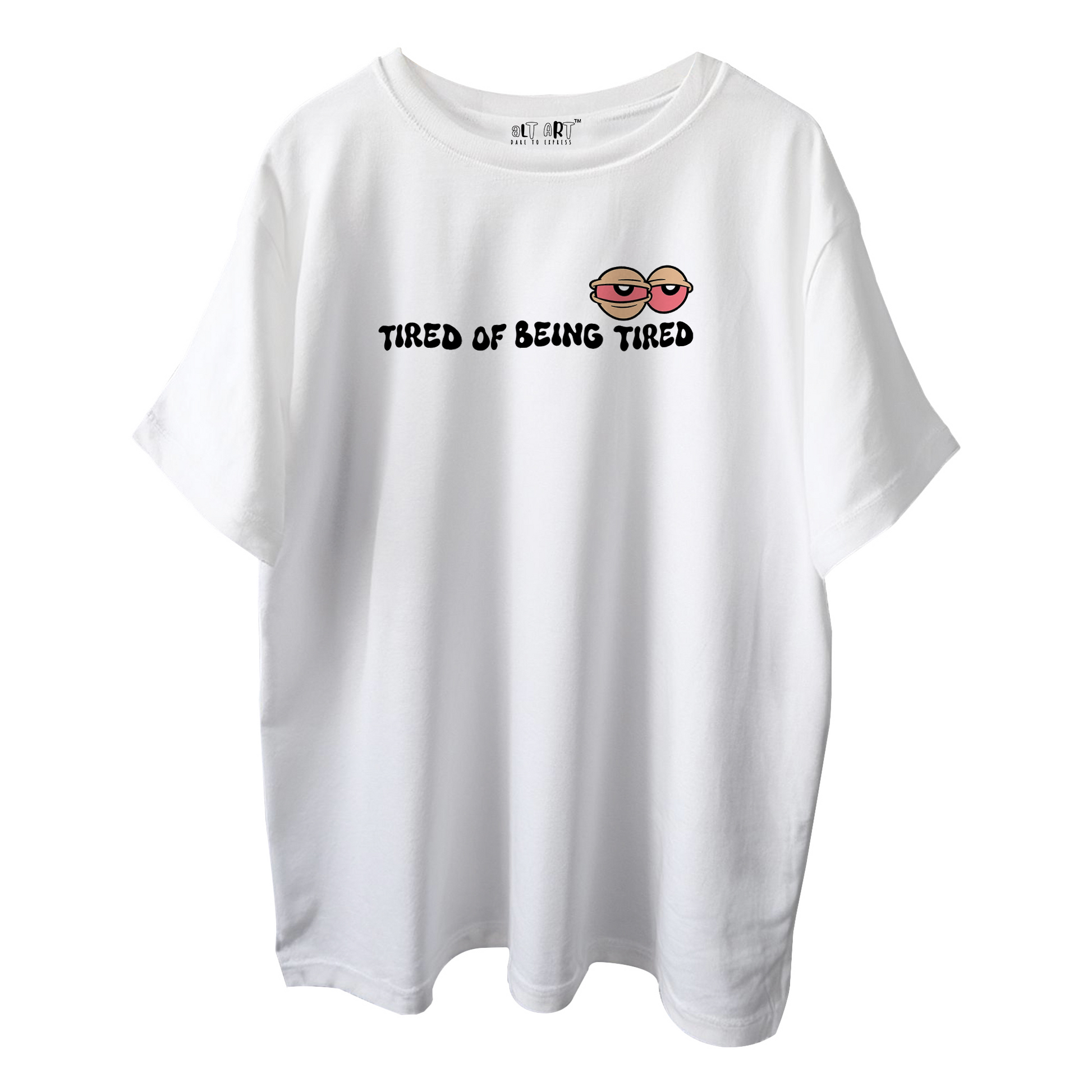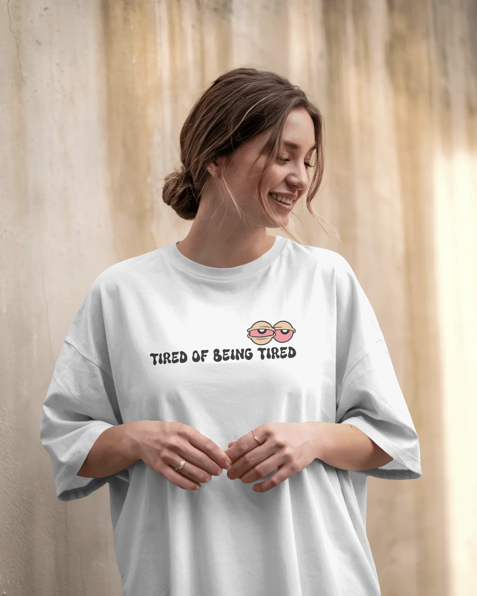 Tired of Being Tired – White Oversized T-Shirt for Women & Girls