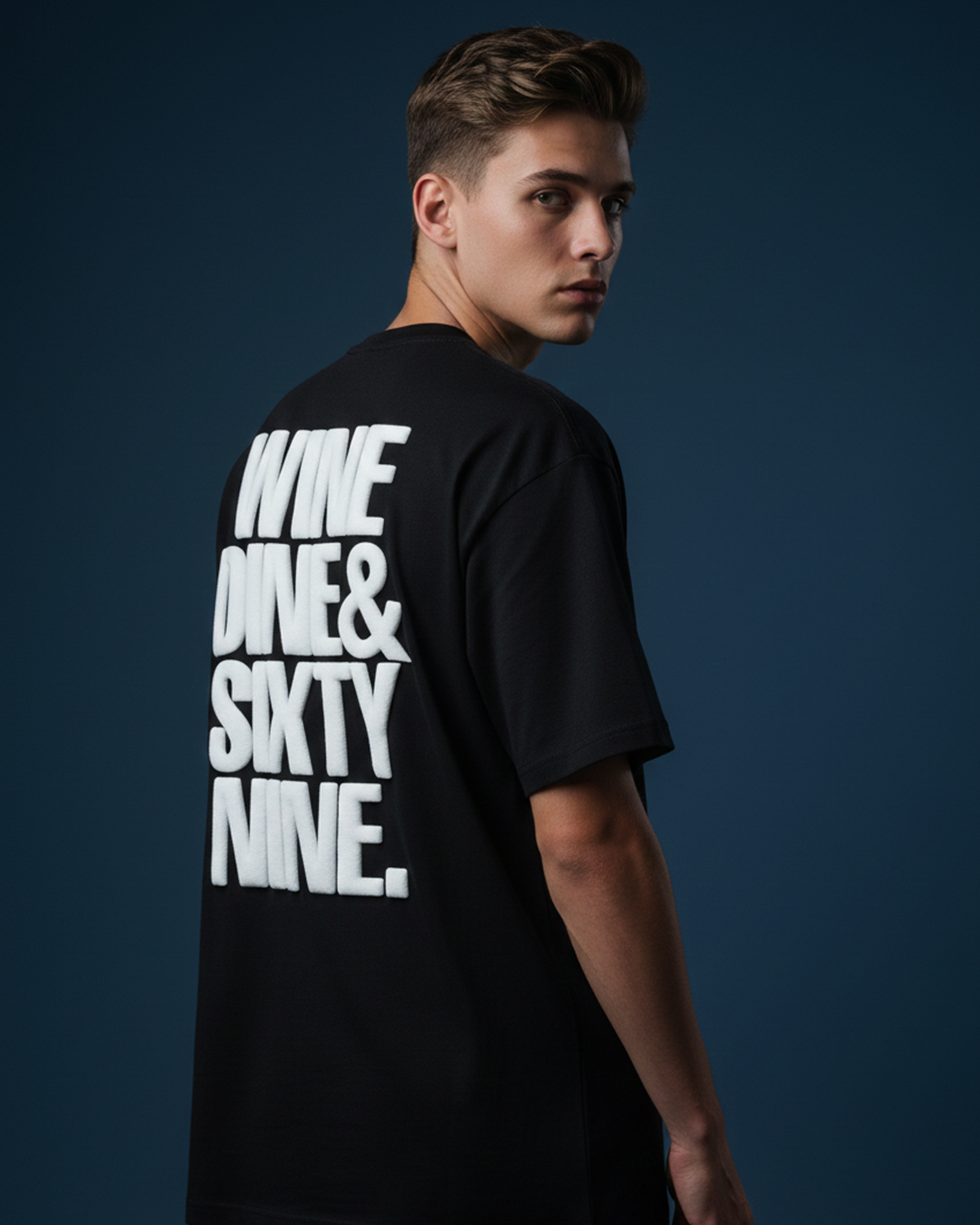 Wine Dine Sixty Nine Puff Print Black Oversized T-Shirt for Men | Heavyweight 3D Raised Print
